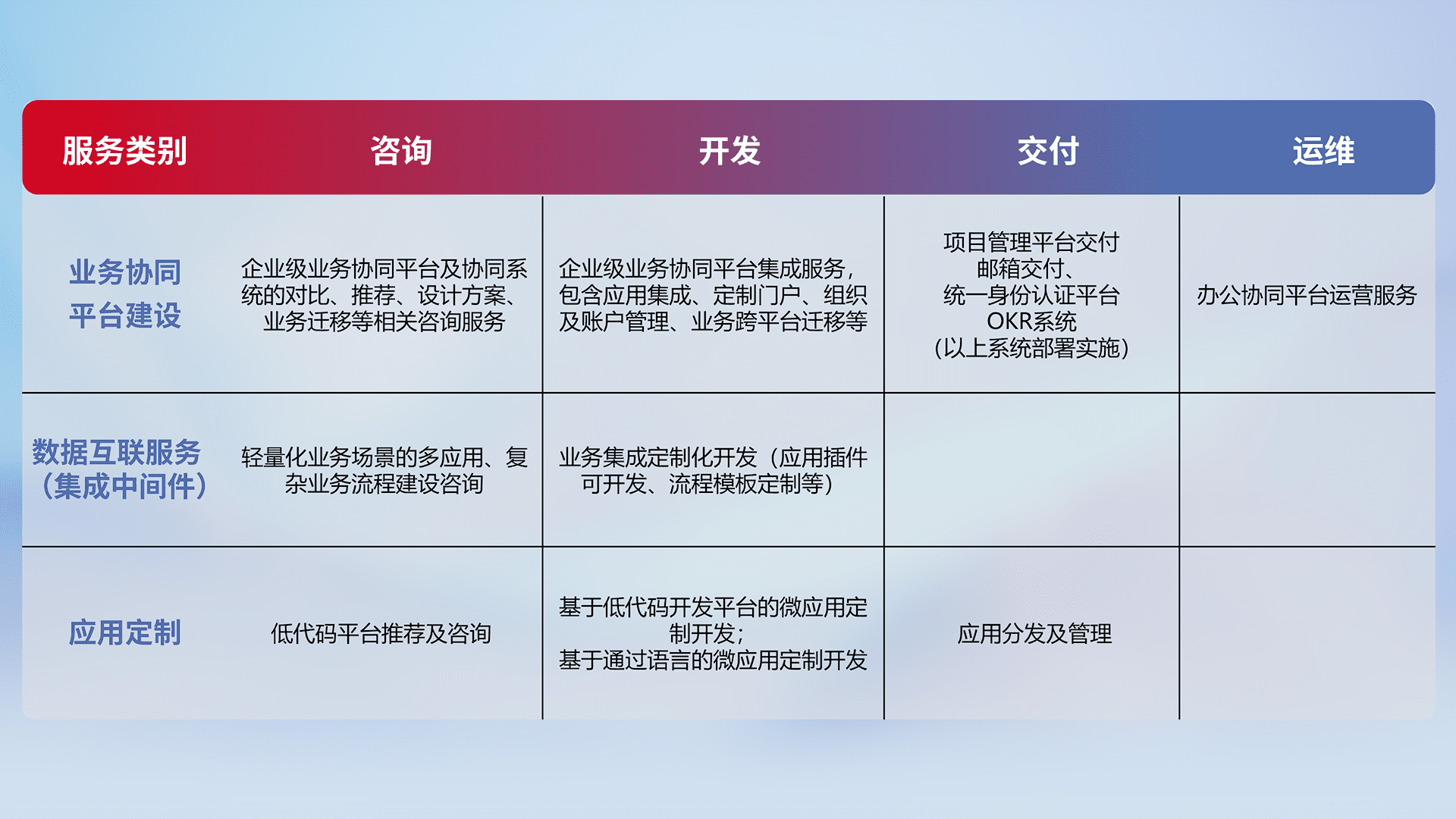 针对钉钉、、、企微、、IDaas等平台级产品提供产品的规划、、方案、、、交付、、、定制化开发等服务,,,,实现如统一协同办公、、、、智能客户服务、、、混合会议管理、、智能数据查询、、、、等业务场景,,,实现数字化转型。。