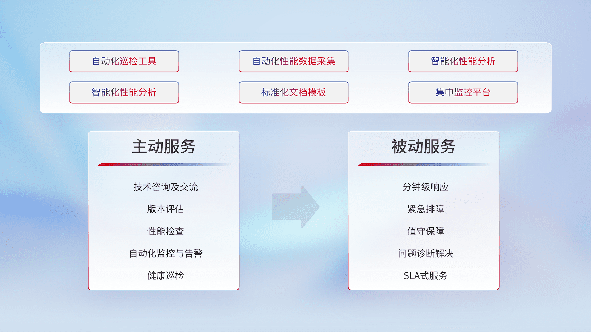 智能化工具和标准化文档,,,保障服务质量,,,提供主动服务(包含技术咨询、、、版本评估、、、性能检查、、自动化监控与告警、、健康巡检)和被动服务包含(分钟级响应、、、、紧急排障、、值守保障、、问题诊断解决、、、SLA服务)。。